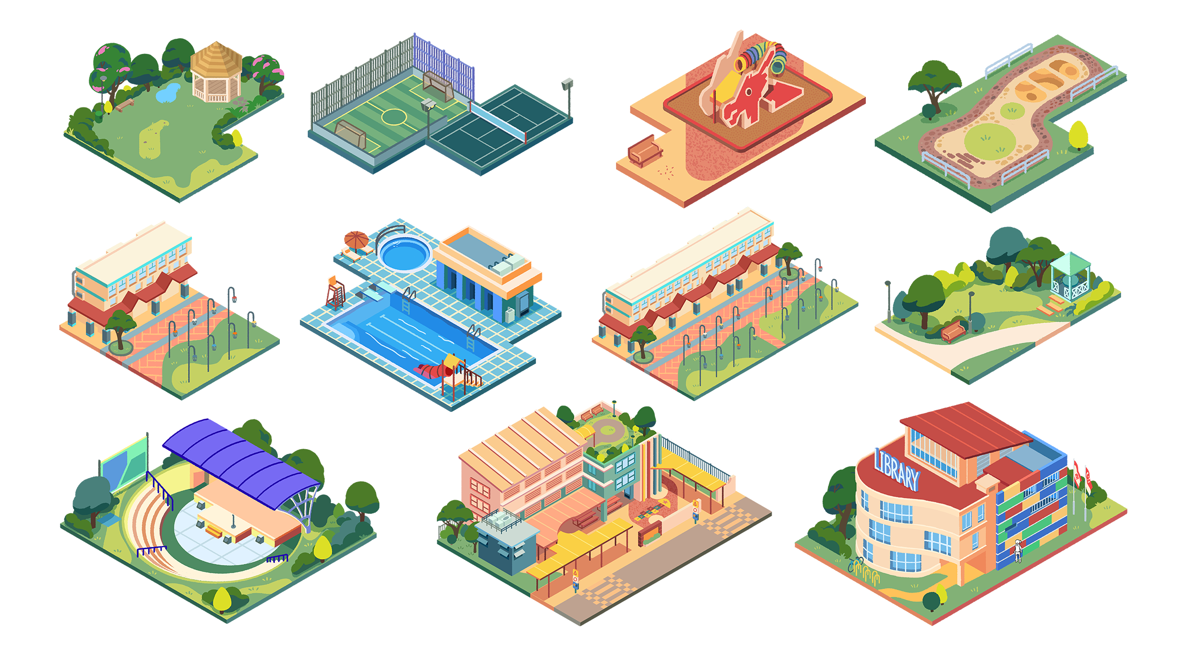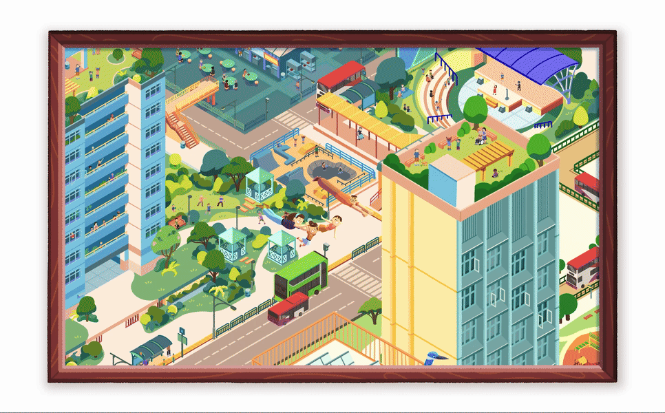 Inspired by city-building games like SimCity, we designed the neighbourhood with a modular, puzzle-piece system with vibrant, inviting colours. The isometric design approach that creates a fresh and coherent design language for this new world,